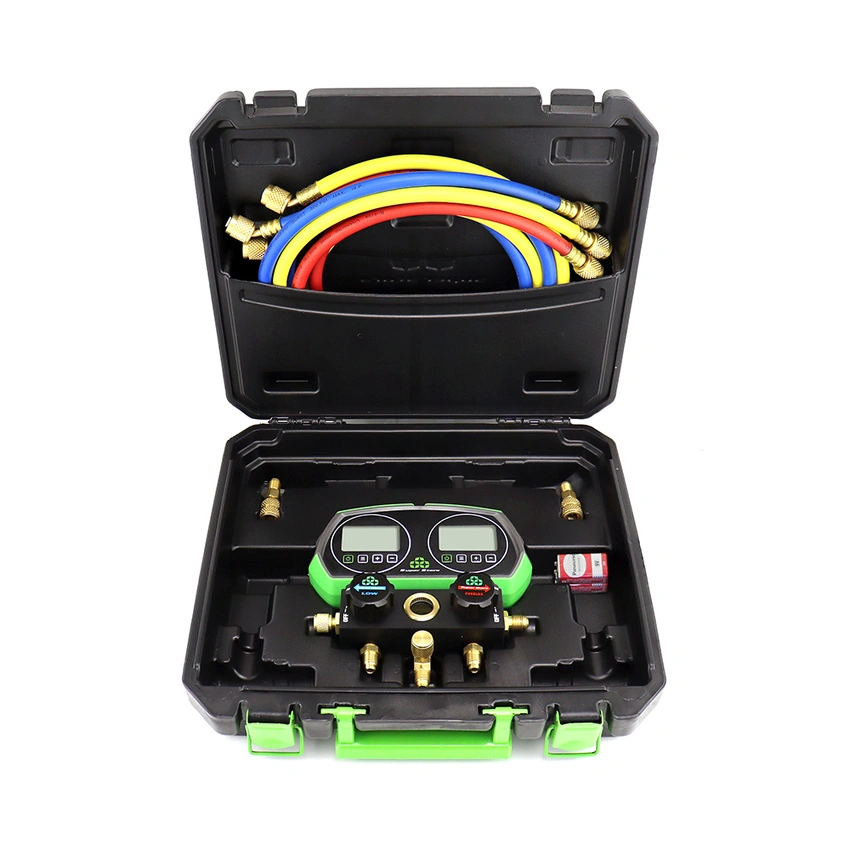 The Super Stars ST-B268D is a digital manifold gauge equipped with manual ball valves and a clear backlit LCD display. The device allows precise measurement of operating pressure, vacuum monitoring, and system diagnostics for a wide range of refrigerants. Its built-in database includes over 80 commonly used refrigerants, making it a versatile and reliable tool for daily HVACR service work.