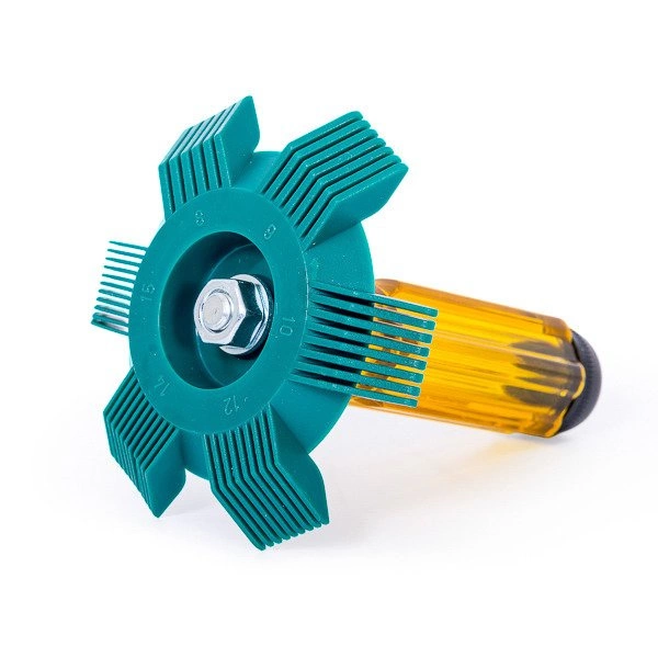 Peigne en plastique pour redresser les ailettes de l'évaporateur et du condenseur, avec deux inserts pour différentes tailles d'ailettes. Les peignes rigides en plastique façonnent parfaitement les ailettes courbées, rétablissant la libre circulation de l'air et l'échange de température.