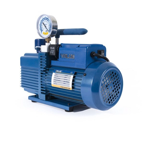Pompe à palettes bi-étagée pour les applications de réfrigération et de conditionnement d'air, équipée d'un vacuomètre de haute précision, d'un clapet anti-retour pour éviter les retours d'huile et d'un grand voyant pour indiquer le niveau d'huile. Deux bouteilles d'huile de 330 ml incluses.
