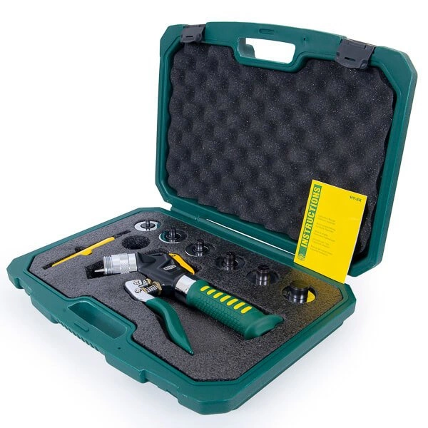 Expandeur hydraulique HY-EX-6 de Refco pour les tubes de cuivre en pouces utilisés dans les applications de réfrigération et de conditionnement d'air. Un instrument qui facilite parfaitement le travail de l'installateur lorsqu'il s'agit de raccorder deux sections de tuyau en cuivre souple. Equipé d'inserts 3/8", 1/2, 5/8", 3/4", 7/8" , 1-1/8". Livré dans une mallette en PVC dur, équipé en plus d'un lanceur d'alerte