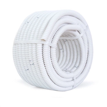 Tuyau flexible pour l'évacuation des condensats. La surface extérieure ondulée rend le tuyau résistant aux pliures et aux dommages, tout en permettant de modeler librement le parcours d'évacuation des condensats de l'unité intérieure.