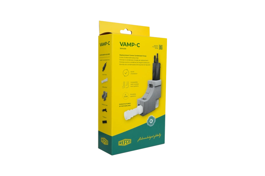 La REFCO VAMP-C est une pompe à condensats compacte et moderne conçue pour une installation dans les coins des conduits de climatisation. Sa conception ingénieuse permet de remplacer rapidement les pompes existantes sans modifier l’installation. Le boîtier peut être ajusté ou découpé pour s’adapter parfaitement à toute configuration.