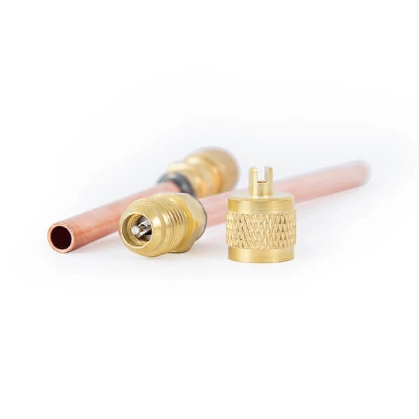 Raccord de service Schrader avec un filetage standard de 1/4" SAE, il permet de connecter rapidement un équipement de contrôle externe et d'ajouter ou de retirer du réfrigérant du système de réfrigération à l'aide d'un tuyau d'entretien. Le bouchon de sécurité est équipé d'un embout permettant de dévisser la valve et d'un joint d'étanchéité afin d'éviter toute fuite indésirable.