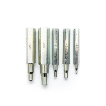 Un jeu de 5 mandrins en acier pour fendre les extrémités des tubes en cuivre, diamètres 1/4", 5/16", 3/8", 1/2", 5/8". Une fois que l'extrémité du tube a été suffisamment chauffée, le mandrin et le marteau appropriés peuvent être utilisés pour élargir le tube afin d'insérer une deuxième section pour les assembler par soudure . Cela élimine la nécessité d'un composant de prise supplémentaire et réduit la quantité de soudure.