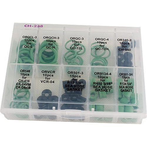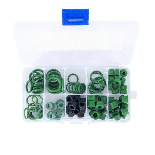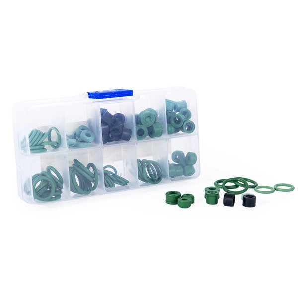 Jeu de joints pour vannes, tuyaux de remplissage (pour différents réfrigérants) et raccords rapides pour systèmes de climatisation de véhicules.