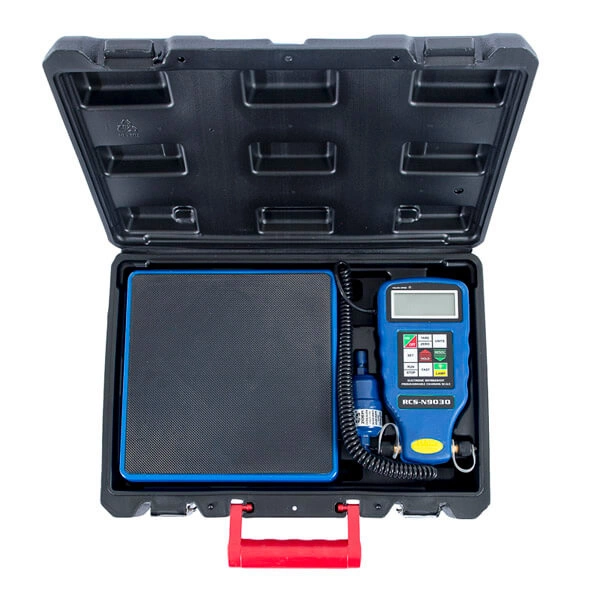 Balance électronique pour réfrigérants dans un boîtier en PVC dur avec une portée allant jusqu'à 100 kg (220 lbs). Idéal pour le remplissage des systèmes de réfrigération et de climatisation ainsi que pour le contrôle de la quantité de réfrigérant retirée du système. Grâce à ses dimensions réduites et à son faible poids (5,2 kg), il est idéal pour le travail sur le terrain. Équipé d'une électrovanne qui coupe automatiquement le flux de fluide lorsque la quantité "programmée" est dépassée