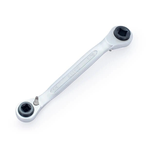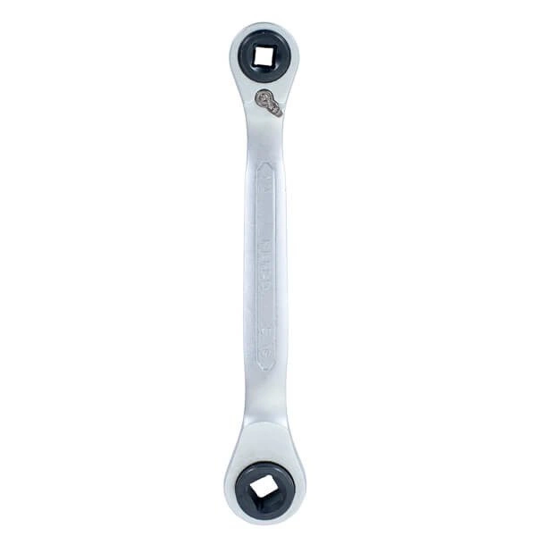 Ventilschlüssel mit Ratsche, Größen: 1/4”, 3/8”, 3/16”, 5/16”. Der gekröpfte Handgriff erlaubt es, an Ventile in schwerzugänglichen Bereichen zu gelangen.