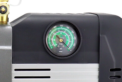Hochleistungs-Vakuumpumpe mit integriertem Magnetventil und Vakuummeter, bürstenlosem DC-Motor, funkenfreier Konstruktion, integriertem Ölfilter, Messing-Ansaugstutzen und großem Ölschauglas.