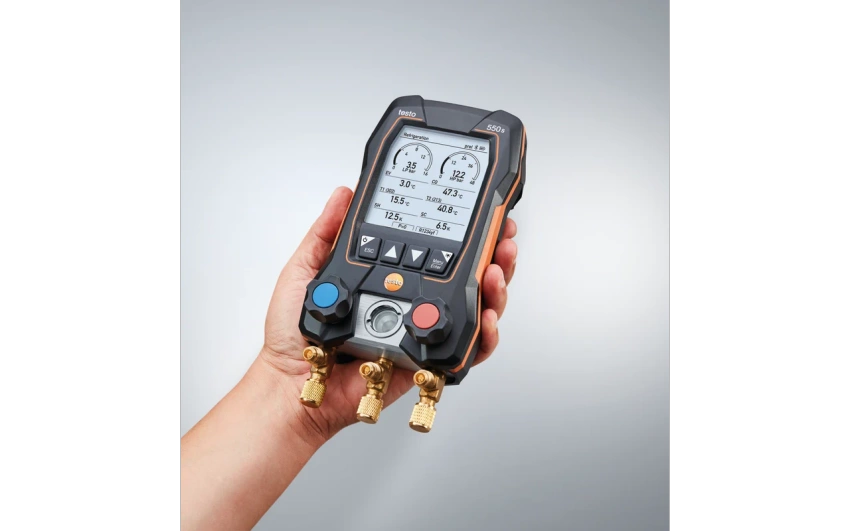 Elektroniczna oprawa zaworowa testo 550s Smart Kit to niezastąpione narzędzie dla serwisantów instalacji chłodniczych, klimatyzacyjnych oraz pomp ciepła. Kompaktowa i solidna konstrukcja z 2-drożną baterią zaworów umożliwia wygodne i precyzyjne pomiary. Duży wyświetlacz graficzny zapewnia pełną czytelność wyników, a wbudowany moduł Bluetooth pozwala na bezprzewodową obsługę oraz analizę wyników pomiarowych za pomocą aplikacji mobilnej testo Smart App. Dzięki temu możliwe jest szybkie dokumentowanie i przesyłanie raportów bezpośrednio z miejsca pracy.
