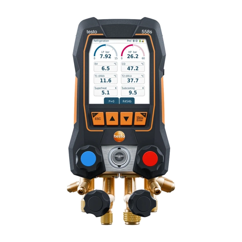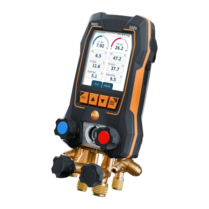 Opis produktu: Testo 558s to nowoczesna, inteligentna oprawa zaworowa z łącznością Bluetooth oraz czterodrożną baterią zaworów, przeznaczona do obsługi instalacji chłodniczych, klimatyzacyjnych oraz pomp ciepła. W połączeniu z bezprzewodowymi sondami temperatury i podciśnienia oraz aplikacją Testo Smart App, stanowi kompletne, mobilne laboratorium pomiarowe dla profesjonalistów HVACR. Urządzenie umożliwia precyzyjne pomiary, rejestrację danych, wizualizację trendów i wygodne zarządzanie dokumentacją. Dotykowy wyświetlacz zapewnia intuicyjną obsługę, a możliwość pracy także przy użyciu przycisków sprawdza się w wymagających warunkach (np. w rękawicach).
